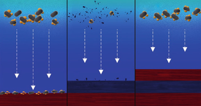 When they die, the skeletons of tiny marine organisms fall to the seafloor. In deep ocean water most skeletons dissolve in the acidic water, except for those made from silica. As layers of these skeletons build up, pressure and chemical changes convert them into rock known as chert.