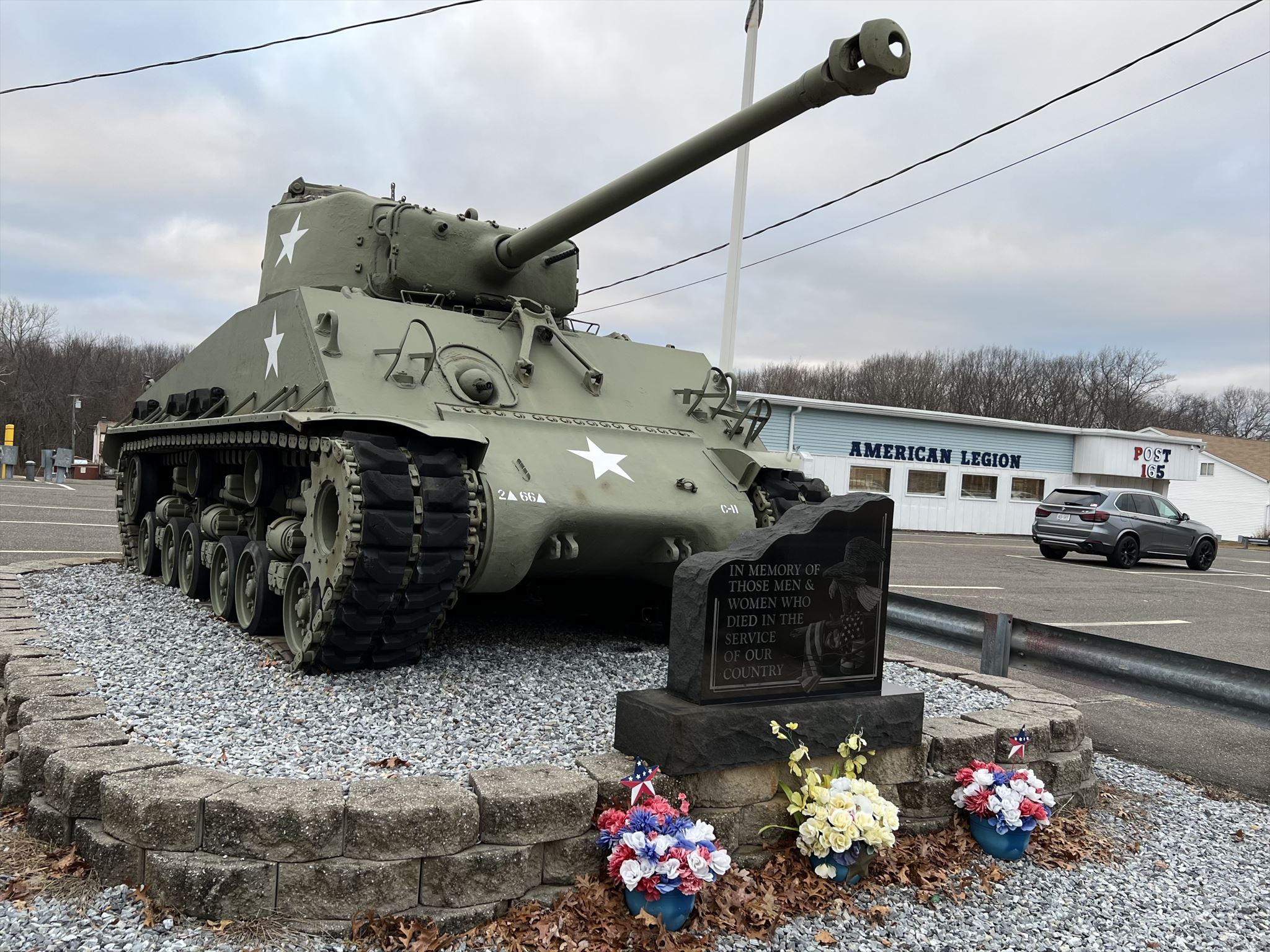 The tank served during WWII. It was built in the winter of 1944 by Chrysler and was on the battlefields of Italy by the summer of 1945 and possibly later in Korea. The tank was totally refurbished by members of the United States Army Brotherhood of Tankers (USABOT). They stripped the tank of paint and grease and applied an initial primer; it was then painted with authentic lusterless olive crab. The team stenciled on an authentic unit designation C16, C for Connecticut and 16 for the first two post numbers. They also added new headlights and taillights. When the tank was completed the Boy Scouts completed a community service project and beautified the area. A re-dedication ceremony was held on Sunday, August 18, 2019 at noon at the American Legion Post.