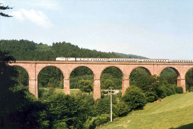 1882 in Betrieb genommen, wird die Steinbogenbrücke noch heute von der Odenwaldbahn mehrmals täglich zwischen den Haltestellen Erbach und Beerfelden-Hetzbach überquert.