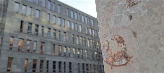 Here we encounter Jurassic ammonites, which are embedded in limestone from Treuchtlingen, Germany. Wall tiles like this can be found, for example, in Brno or Dresden.