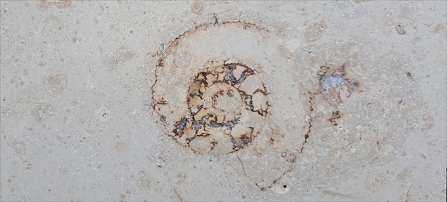 Zde se setkáváme s jurskými amonity, kteří jsou usazeny ve vápenci z německého Treuchtlingenu. Obklady jako tento se nachází např. v Brně či Drážďanech.