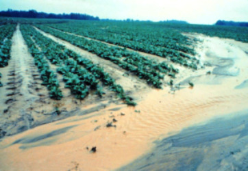 2. Sheet Erosion : is the result when lots of rain falls and the soil gets saturated with water and any subsequent rain that falls collects on top of the soil and flows away, called "runoff". When runoff ocurs, it will pick up some of the loosened underlaying soil particles and move them away from their origin. These particles are then called "sediment" and will be deposited elsewhere when the physical characteristics of the runoff allows for the sediment to precipitate. Such runoffs may be a tiny little streamlet in a flower bed... or a massive raging river that transports many metric tons of soil