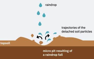 1. Splash Erosion : is the effect of a single raindrop on soft soil where it impacts. The raindrop has a mass and a velocity and when it hits the ground it makes an indent or small crater. The soil particles that are loosened in the process are ejected from the crater and falls away from where it was originally. This can be as small as a few millimeters away, but the collective effect of millions of raindrops at the same time can loosen and displace large quantities of soil at a time