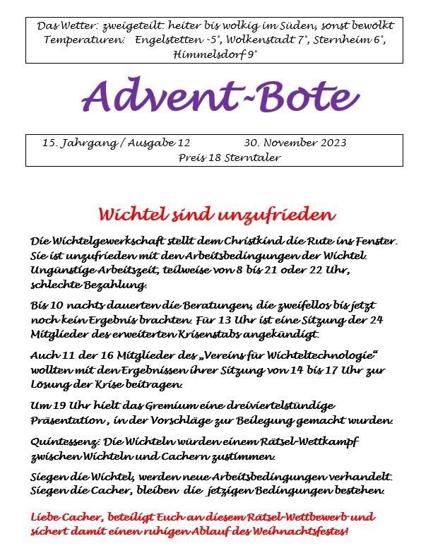 Cacher, wie die Zeit vergeht!!!Bald schon kommt das Christkind. Dein Blick fällt auf den heutigen Adventboten in neuem Design. Was liest du da? Es rumort in himmlischen Gefilden! Da musst Du doch was dagegen tun. Klick den Artikel an und lies ihn Dir einmal genau durch.