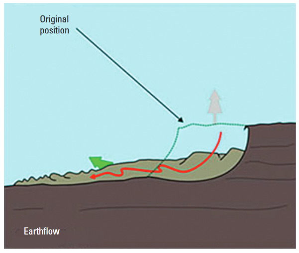 Earthflow Earthflows can occur on gentle to moderate slopes, generally in fine-grained soil, commonly clay or silt or sand. Earthflows can range from very slow (creep) to rapid and catastrophic.