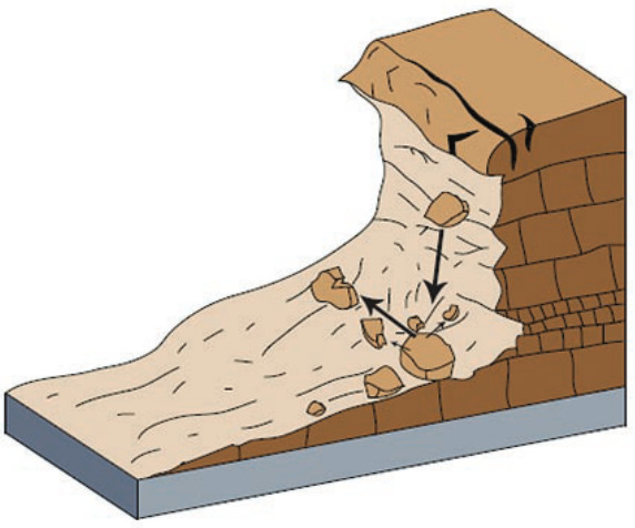 Rockfall Falls are abrupt, downward movements of rock or earth, or both, that detach from steep slopes or cliffs. The falling material usually strikes the lower slope at angles less than the angle of fall, causing bouncing. The falling mass may break on impact, may begin rolling on steeper slopes, and may continue until the terrain flattens.