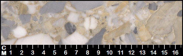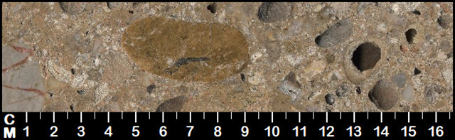 feinkörnig mit abgerundetem Geröll, gelegentlich mit Hohlräumen |