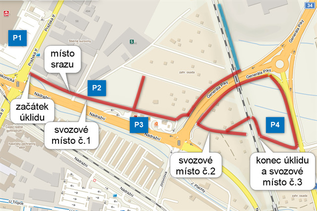 - Úklid bude postupovat od Pražské třídy a vyčistíme prostor až k Vodní ulici (podle počtu účastníků možná ještě dál). Po roce od posledního úklidu se opět nachází množství odhozených odpadků. Pod nadjezdem, naproti Benzině, v celé délce příkopu i u Dobrovodského potoka. Dále pod železničním viaduktem a v blízkosti železnice.