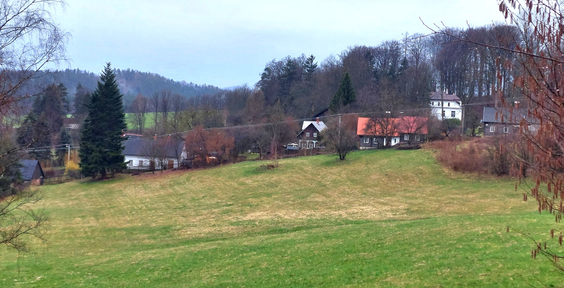Souřadnice schránky vás přivedou na úbočí Trávnické stráně. Z něj je pěkný výhled nejen na blízké i vzdálenější chaloupky a stavení, ale také na dominantní Zelený vrch. Na jeho přivrácené straně můžete odsud zahlédnout známou Schillerovu vyhlídku.