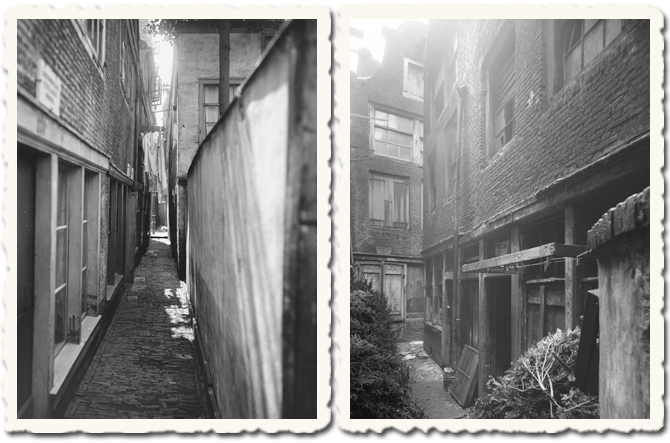 Midden rechts: Penschrijversgang, Tuinstraat. Bron: Stadsarchief Amsterdam, vervaardiger: onbekend.