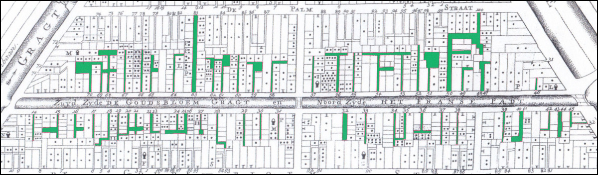 Onder: Burgerwijkkaart uit 1751 van de Goudsbloemgracht en Het Franse Padt, thans Willemsstraat. Alle gangen zijn groen gekleurd. Bron: Stadsarchief Amsterdam, vervaardiger: Caspar Philips Jacobsz.