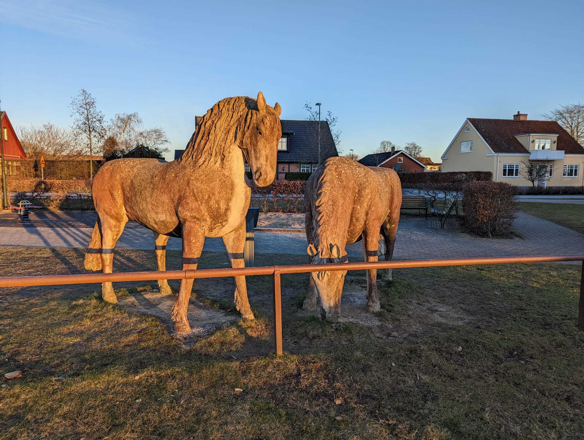 hölls ända fram till mitten av 1980-talet. Dessa betonghästar ersatte den tidigare ardennerhästen i trä, Konstnären Jackie Kaplan Persson, född i Davenport, Iowa, USA kom till Sverige 1998 och är i dag bosatt i Veberöd. Jackie Kaplan arbetar i lera, men övervägande med större skulpturer i betong. Hästar är ett av konstnärens favoritobjekt.
