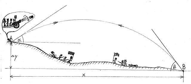 úkolem je vypočítat náměr děla α (úhel alfa) v jednotkách mils