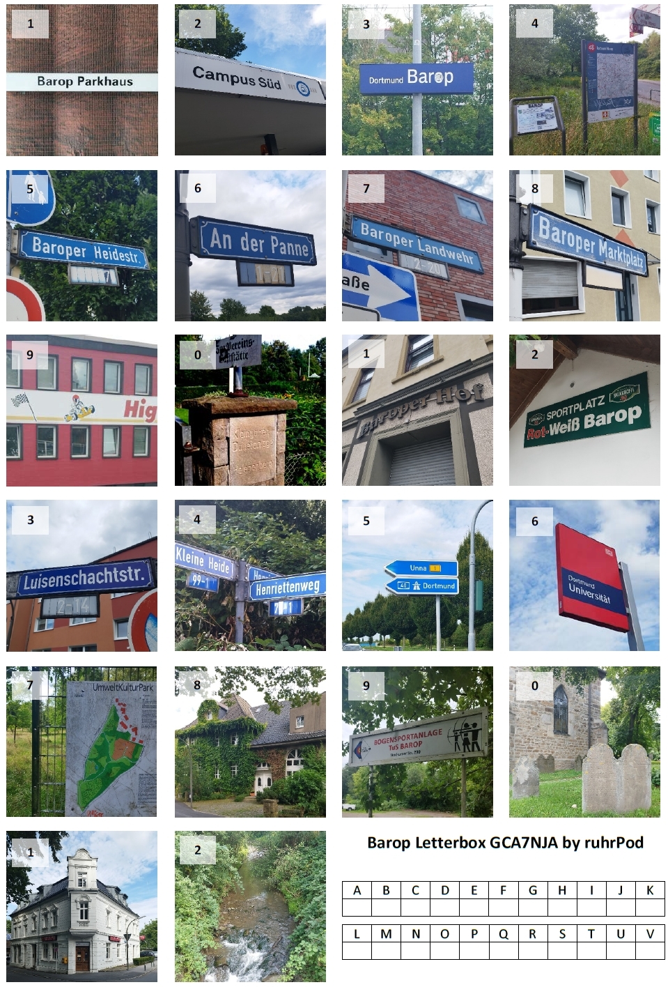 Diese Letterbox ist den Leuten gewidmet, die sich bei Multis immer schon zu Hause gründlich vorbereiten und die Lösungen vorab ermitteln. Wer mag, kann aber natürlich auch in Barop vor Ort umsehen. Generell müssen keine Wege verlassen werden, schon gar nicht in einem der Naturschutzgebiete. Die Letterbox kann wahlweise traditionell mit Kompass und Karte oder mit GPS-Empfänger gefunden werden. In beiden Fällen müssen vorher an den 22 Standorten (A bis V) die Ziffern der Fotoausschnitte der Kollage den jeweiligen Wegpunkten zugeordnet werden. Wenn ihr das gemacht habt, wisst ihr ziemlich gut, wo Barop liegt.