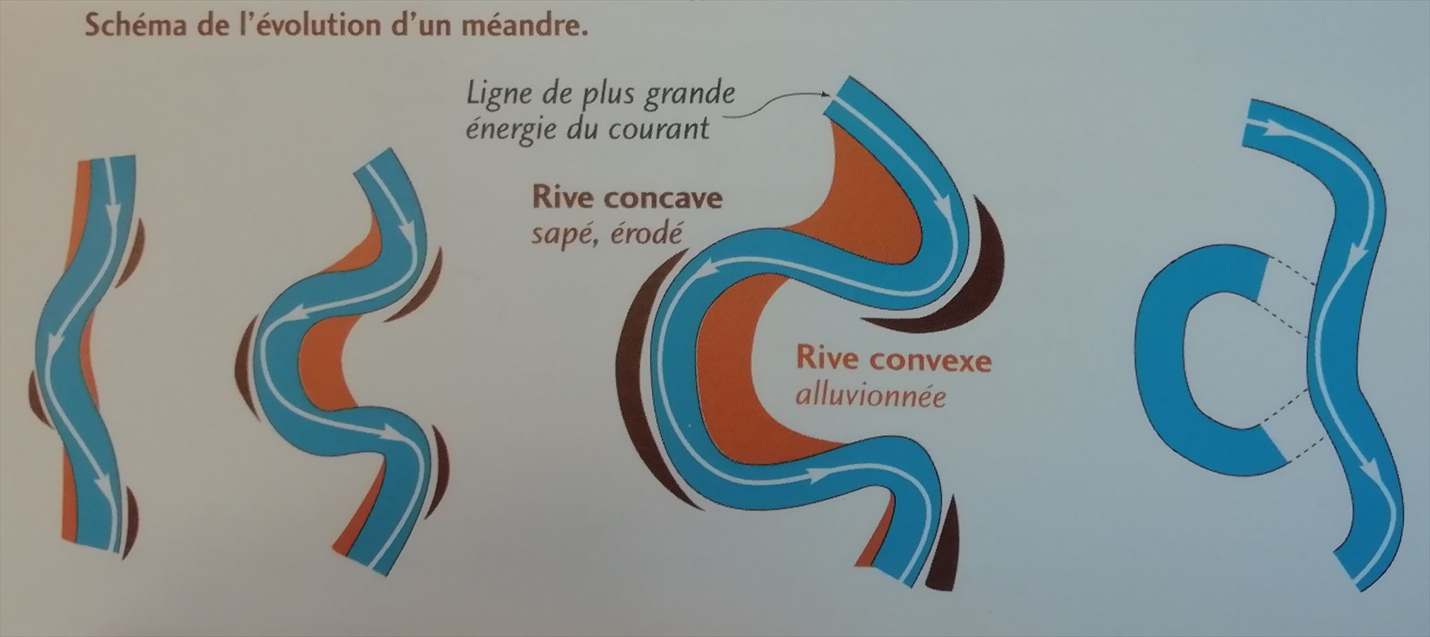 L’eau subit une force centrifuge qui la déporte vers l’extérieur et engendre une érosion régulière de la rive concave. Les berges de cette rive reculent et finissent par avoir un versant raide. Sur la rive opposée, la pente est plus douce et l’on observe des dépôts qui sont déposés par l’eau.