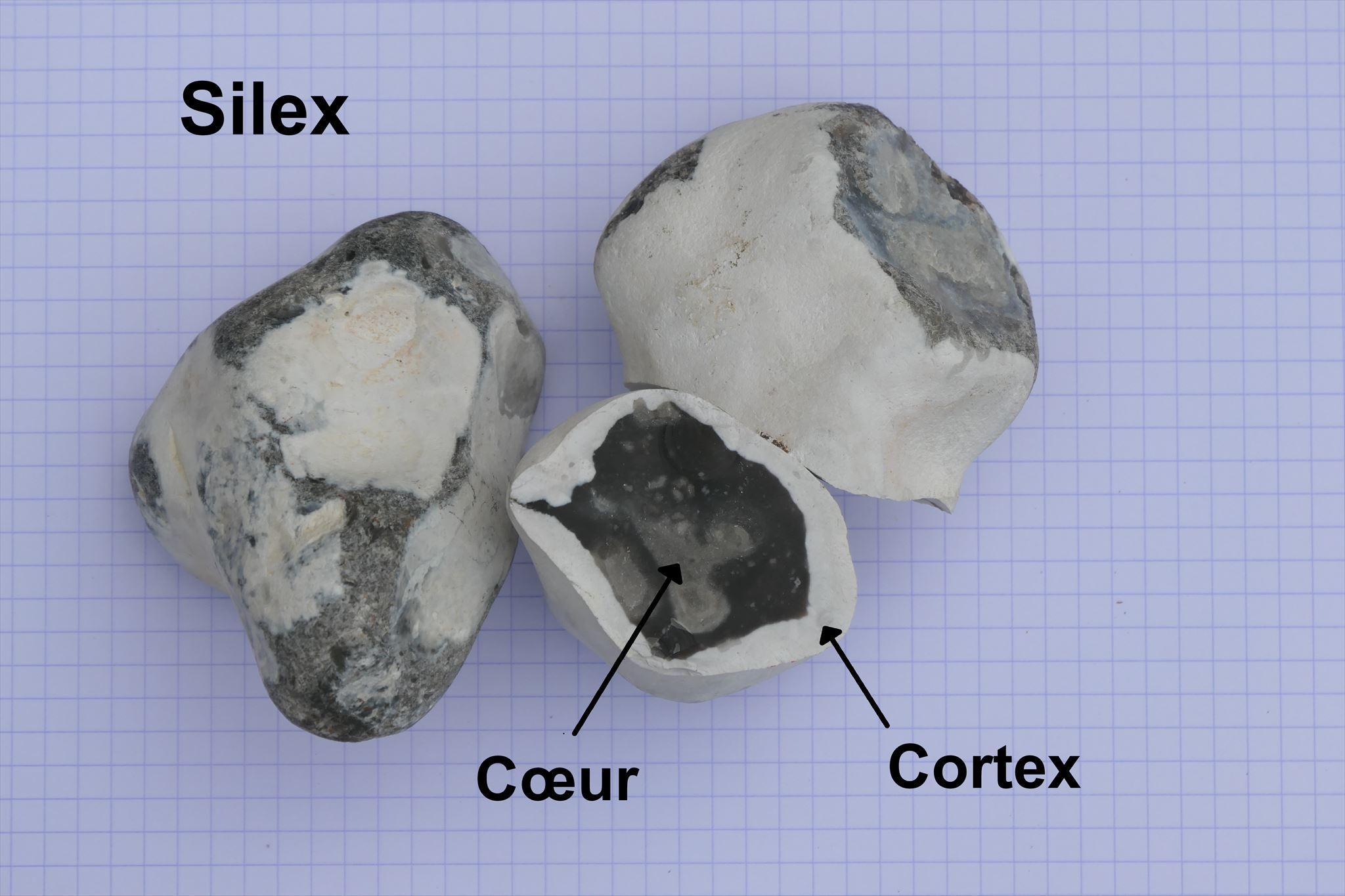 Le silex est une roche très dure d’origine sédimentaire, composée de silice (SiO2) qui apparaît dans des roches calcaires, en particulier de la craie. Nous retrouvons le silex en fines couches ou en rangées de nodules dispersés. Les silex sont de forme irrégulière le plus souvent en rognons ou en tubercules.