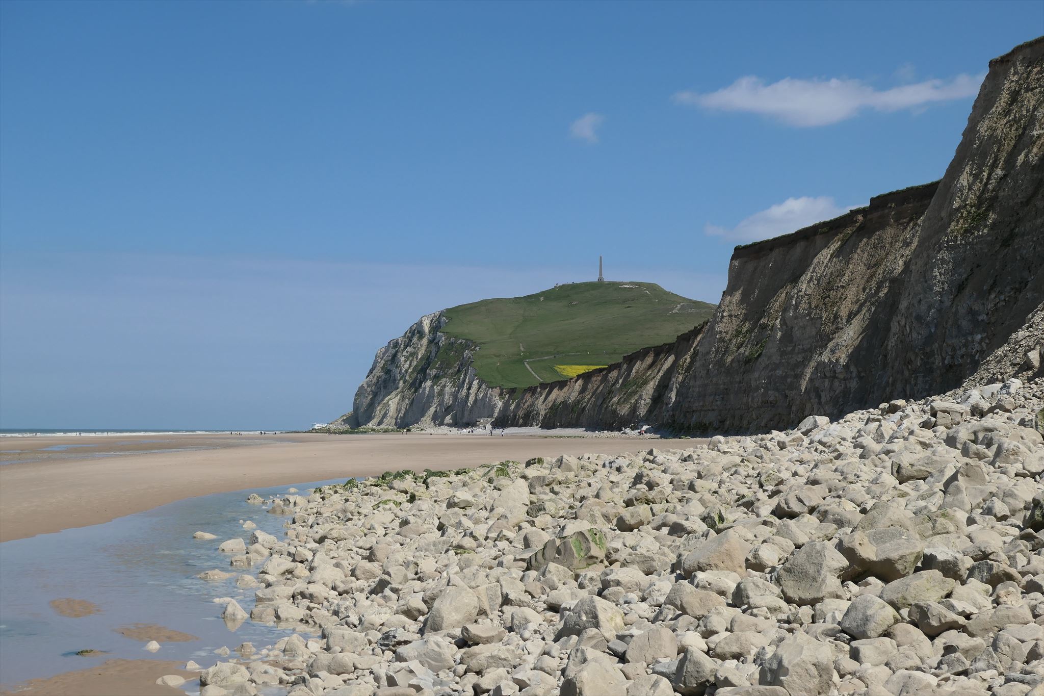 Located in Escalles in the Pas-de-Calais, the cliffs of Cap Blanc-Nez rise up to 134 m high above a rocky foreshore. They expose several varieties of chalks, in superimposed layers and affected by a slight dip towards the northeast. These chalks represent the Cenomanian and Turonian geological stages. They rest on the dark clays of the Albian stage visible on the foreshore and at the base of the Petit Blanc-Nez. Between the latter and a little beyond the Cran d'Escalles, above all outcrops the "blue chalk" dating from the Lower Cenomanian to the Middle Cenomanian, which is made up of numerous chalk-marl alternations of a bluish tint due to the presence of diffuse pyrite. As for the Grand Blanc-Nez, it is formed successively by gray, white, nodular, marly-chalky chalks then with flint towards the top dating from the Middle Cenomanian to the Upper Turonian.