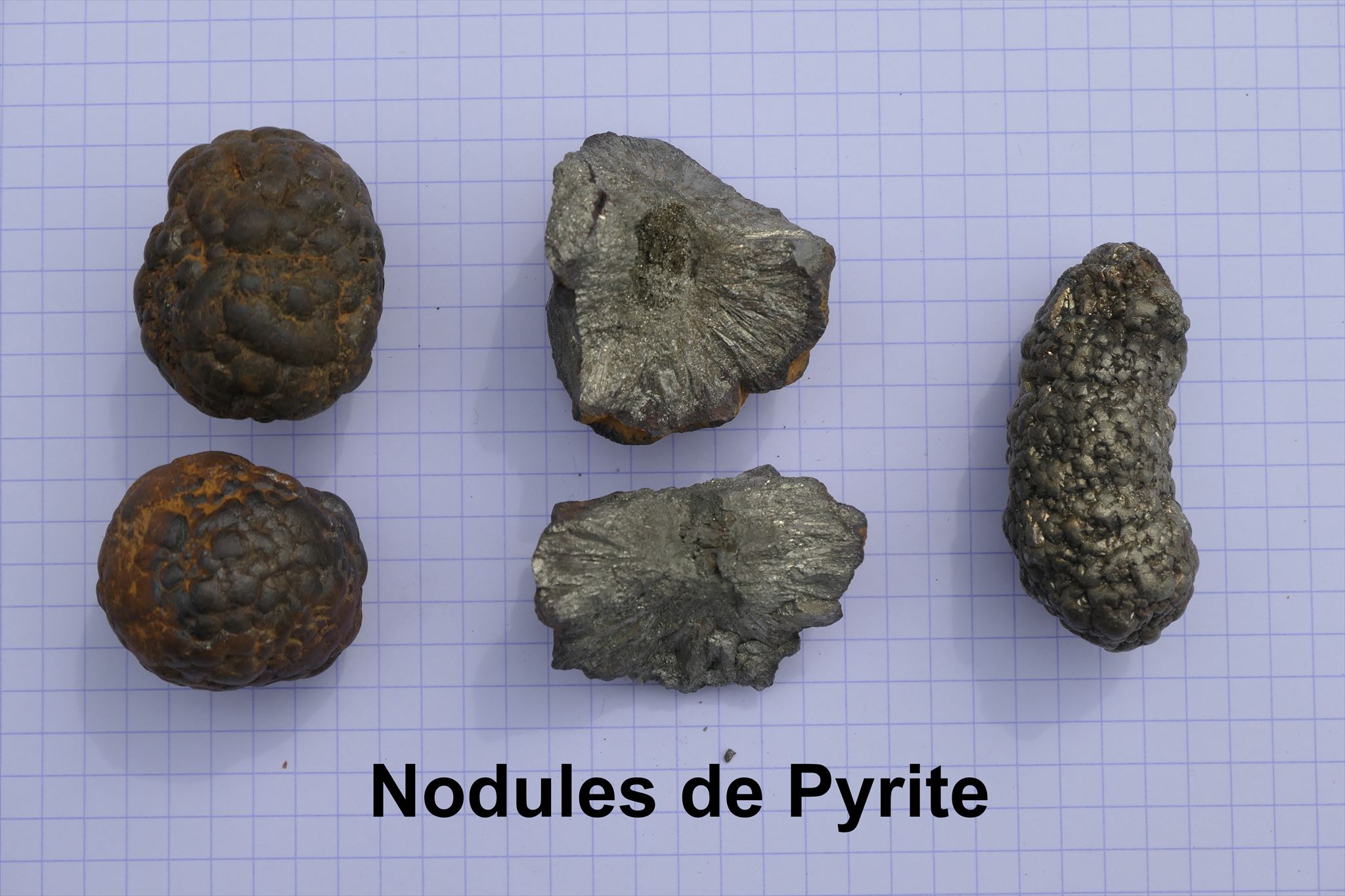 Les nodules de pyrite se forment dans la boue crayeuse en milieu anaérobie contenant du sulfate (SO4)2- et des ions ferriques Fe3+. Dans ce milieu vivent des bactéries et des archées qui « respirent » du sulfate plutôt que de l’oxygène moléculaire (O2). Ces micro-organismes sont dits sulfato-réducteurs et transforment le sulfate en ion sulfure (S2-). Les ions ferriques se réduisent de leur côté en ion ferreux Fe2+. Reste aux ions ferreux et aux ions sulfure à se combiner entre eux pour former de la pyrite (FeS2).