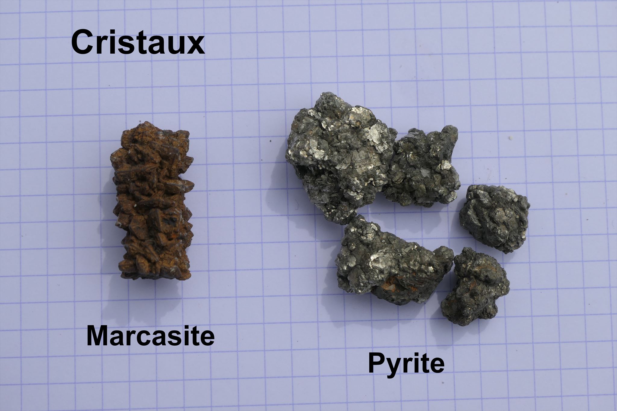 Au Cap Blanc Nez, nous trouvons principalement de la pyrite, elle se présente sous différentes formes, entre l’amas de cristaux ou en nodules fibroradiés. Si vous avez de la chance, vous pourrez trouver des cristaux de marcasite groupés en macle de cristaux aplatis appelés “sperkise” ("pierre en épée" en allemand). Étrangement, les deux systèmes peuvent cohabiter sur un même amas de cristaux.