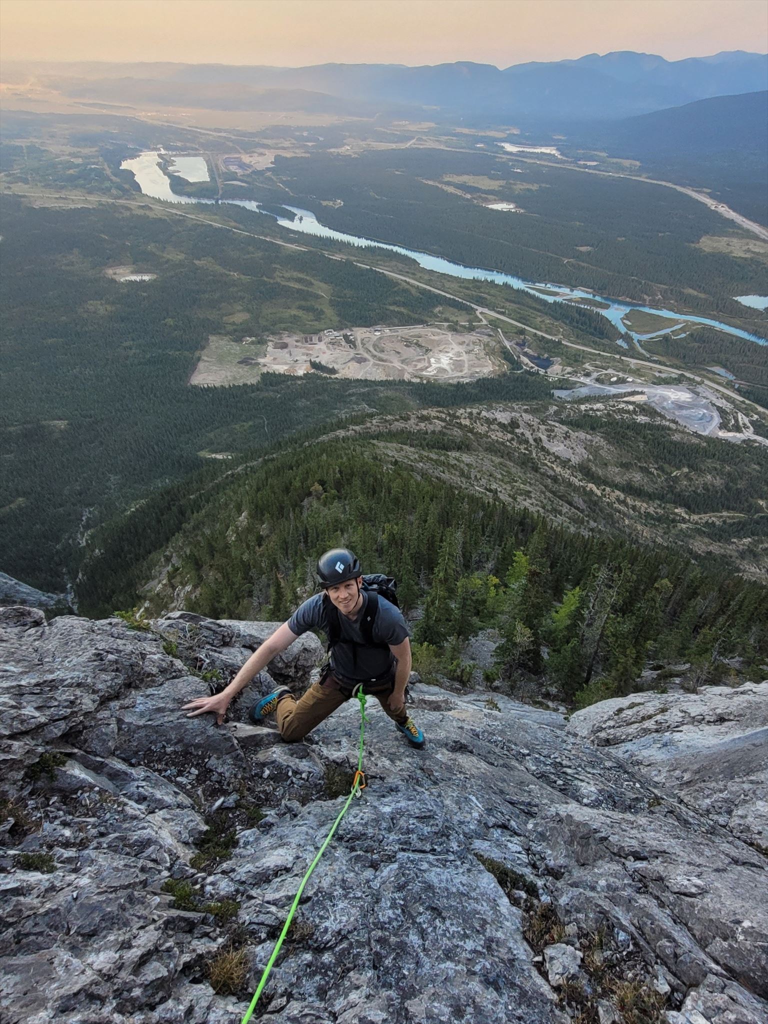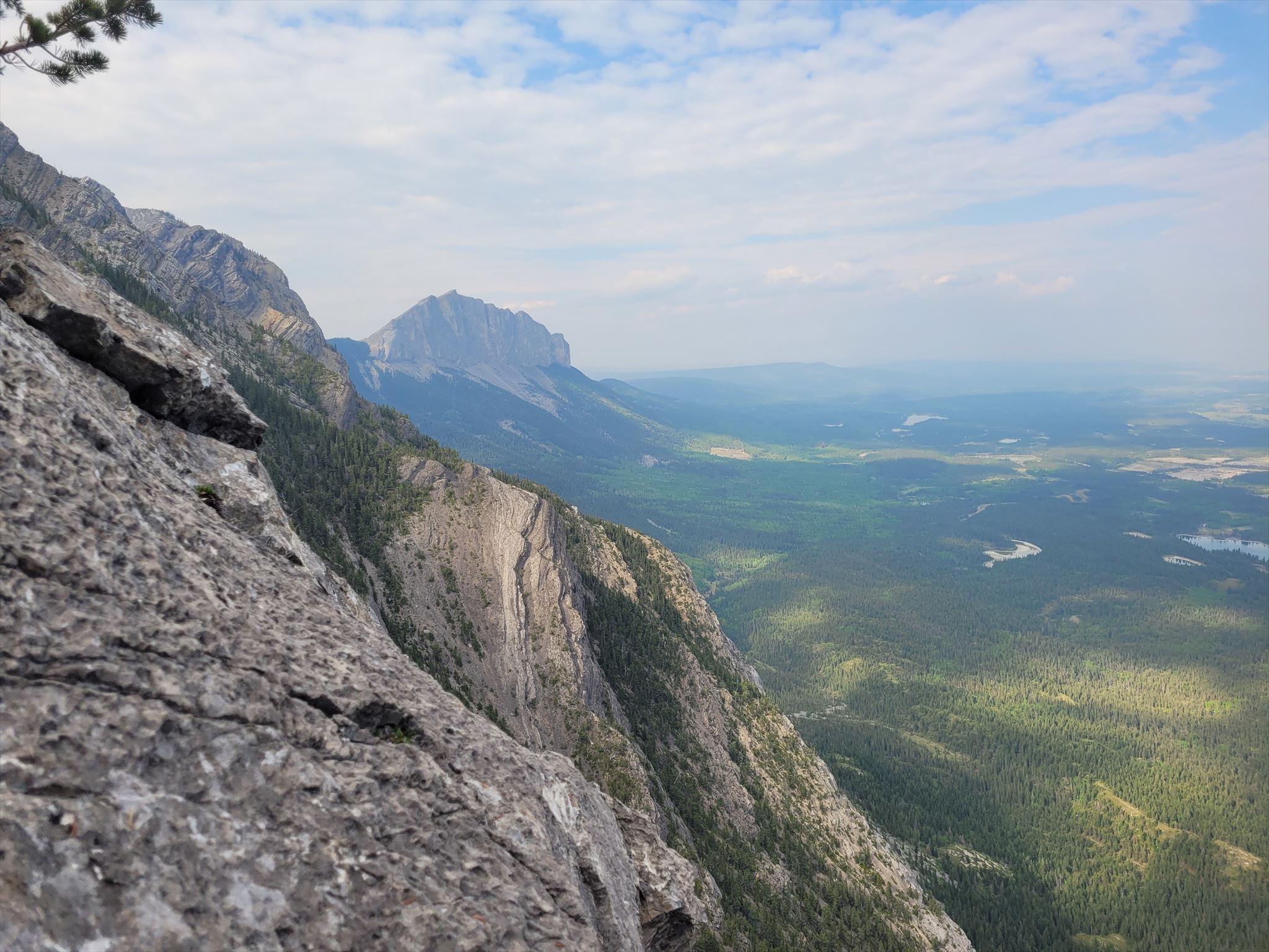 The majority of the route is easy scrambling (hiking), apart from the three climbing pitches listed above and two very short scrambling sections. The two scrambling steps (shown in the photo topo above) are easily scrambled through weaknesses in the cliffbands (waypoints provided). The scrambling is class 3 (moderate) and short. Above the scramble steps, you hike up to an excellent viewpoint of the Bow Valley that I've called the Door Jamb East Ridge Viewpoint. From here, continue hiking up the ridge to reach The Hinge Step, which is the first pitch of actual climbing. Climb up easily past 2 bolts, turn right, clip one additional bolt, then pull through a slightly steeper move on great holds to a bolted anchor. Once above this short pitch, coil up the rope and continue hiking up to the Side Door pitches.