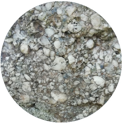 The Gourin puddingstone is found almost everywhere in Brittany. It is a conglomerate composed of rounded pebbles made up of white quartz and rare black phtanite pebbles. The pebbles are centimetric to decimetric in size and enclosed in a whitish sandstone cement.