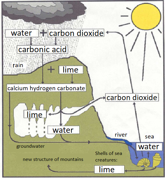 Lime (rock) + water + carbon dioxide –> calcium bicarbonate
