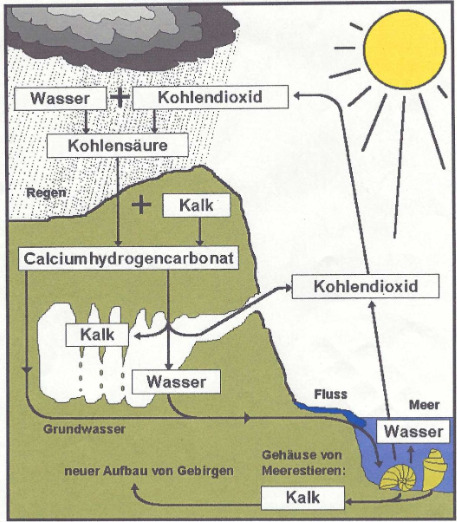 Kalk(gestein) + Wasser + Kohlenstoffdioxid –> Calciumhydrogencarbonat