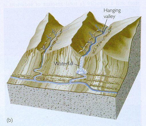 Perhaps one of the more unique geologic features that were formed by glaciers are hanging valleys. Hanging valleys are distinctive geological features formed as a result of glacial erosion and are commonly found in glaciated landscapes. These valleys exhibit a unique topographical relationship with their main, or trunk, valleys. The formation of hanging valleys is primarily attributed to differences in the erosional power of glaciers. As glaciers move down a valley, their immense weight and erosive capabilities lead to the deepening and widening of the main valley, creating a U-shaped profile. However, smaller tributary glaciers, known as hanging glaciers, lack the same erosional force. Consequently, when the ice melts, these hanging valleys are left perched above the main valley, often culminating in striking waterfalls as streams from the hanging valleys plunge into the deeper trunk valley. Hanging valleys serve as a prominent testament to the dynamic interplay of glacial processes and the shaping of Earth's geological features over time.