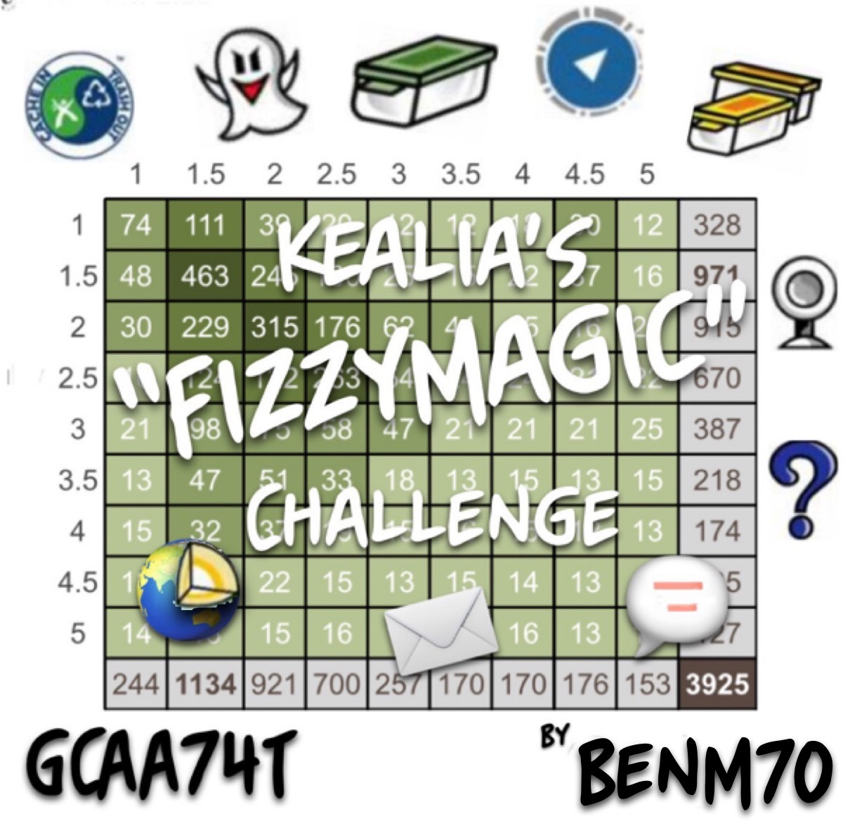 This Cache, as indicated by its name is placed in honour of Kealia's Well Rounded Cacher (The Fizzy Challenge) challenge - GC11E8N which was placed to honour the work of FizzyMagic. Most people think that it just involved filling a grid with at least one of every Difficulty Terrain combination for a total of 81, but it also involved finding one of each of the common types at the time, being the following -