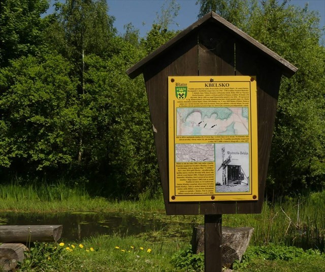 Jestliže jste sem dorazili geovozidlem, nevjížděkte na polní cestu! Zaparkujte ho na plácku u křížku tak, aby příjezdovou cestu vedoucí do osady Kbelsko neblokovalo. Cesta je kilometr dlouhá, úzká a slepá. Nelze se na ní otočit, ale je hojně využívána místními domorodci. V osadě samotné je jenom několik chalup, informační tabule, která informuje, že před dávnými časy tu stával větrný mlýn a také domorodci, kteří si bedlivě střeží svůj klid a samotu...
