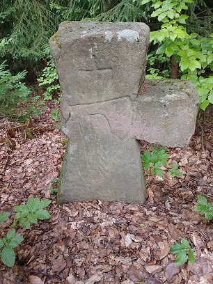 Pískovcový kříž s klínovou nohou a chybějícím levým ramenem je podobný předešlému (GCA6P9T Smírčí kříže Podkrkonoší #17 Třebihošť 2). Na kříži je zřetelný vryp tesařské širočiny, nad ní prostý křížek a vedle topůrka pod ostřím je znázorněn padlý strom. Nejméně sto let byl vyvrácen a byla domněnka, že již není. Po troše úsilí a námaze byl objeven a v roce 1994 opět zasazen u hranic katastru mezi obcemi Třebihošť a Horní Dehtov, které jsou vyznačeny mezníky s vysekaným K 1798 a P 1825. Toto místo má název „Špůrův les“. Rozměry: Výška 87 cm, šířka 60 cm, tloušťka 20 cm.