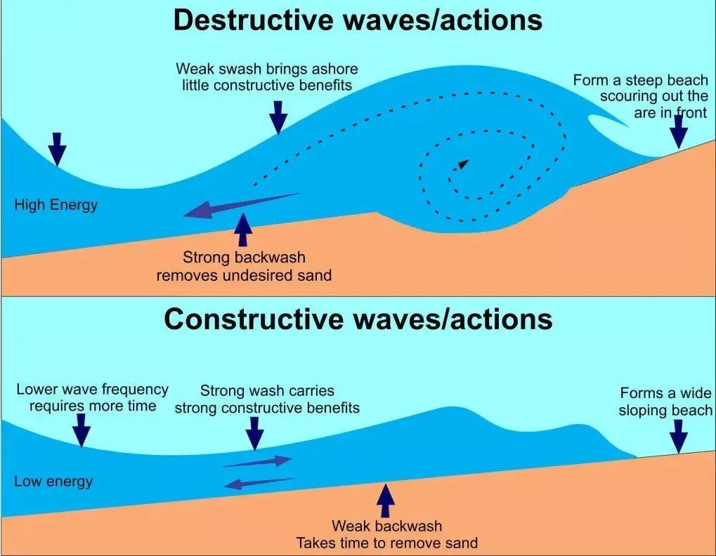 On the other hand, destructive waves possess a shorter wavelength and greater wave height. They have a more intense breaking force as they reach the shoreline, causing erosion and removal of sediment from the beach. The backwash of these waves is stronger than the swash, pulling sand and other materials seaward. Destructive waves are often observed during storms or periods of high wind and generate significant wave energy that can erode cliffs, undercut bluffs, and reshape the coastline. The erosive power of destructive waves contributes to the formation of sea caves, sea arches, and other coastal landforms.