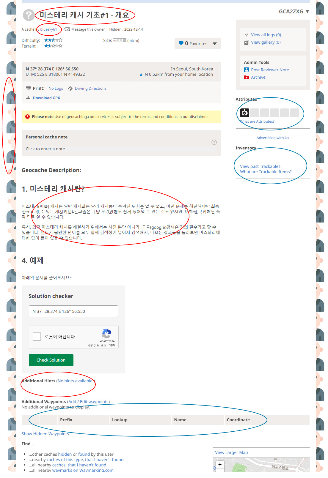 캐시 페이지에서 캐시 주인장이 마음대로 수정할 수 있는 곳은 아래 그림에 표시된 곳입니다. 이중에서 제목, 설치자 이름, 본문, 배경이미지, 힌트 등, 빨간색으로 표시한 곳에 주로 미스테리를 풀기 위한 단서들이 주어집니다. 기타 파란색으로 표시한 속성(Attributes), 보관함(Inventory), 북마크(Bookmarks), 추가 웨이포인트(Additional Waypoints)도 추가로 정보를 넣을 수 있으므로, 미스테리 캐시를 풀기 위해선 본문 뿐만 아니라 여기저기를 잘 살펴봐야 합니다.