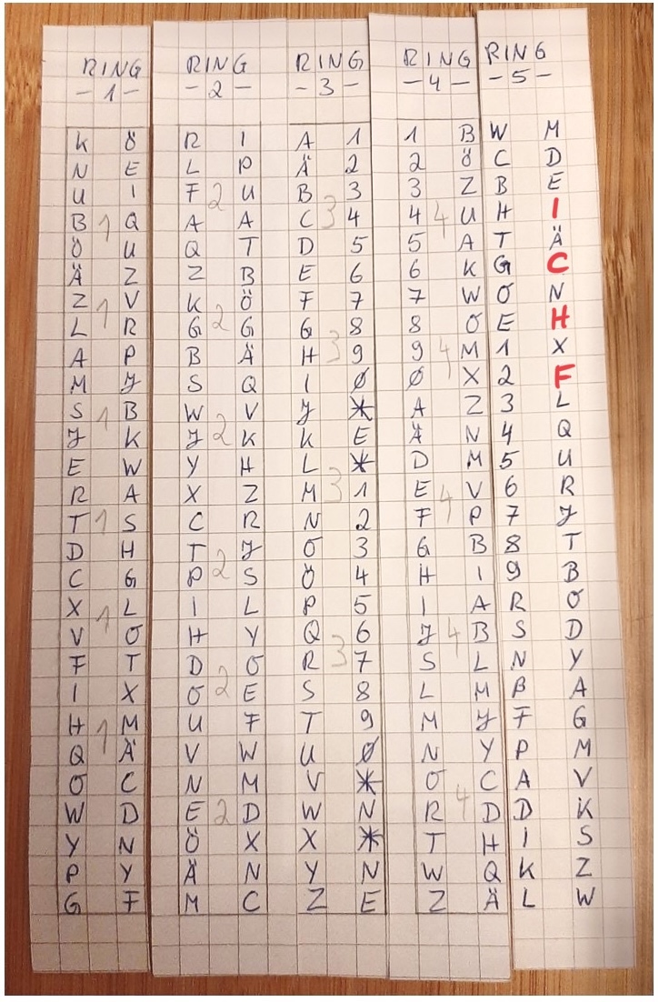 Wichtig: Auch beim ersten Buchstaben, immer erst Weiterschalten, dann Ablesen. Und die Ringe nicht außer der Reihe verdrehen, sonst kommt Ihr durcheinander und dann wird’s schwierig.