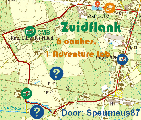 Deze cache maakt deel uit ons geocache-project ZUIDFLANK. Dit is een wandel- of fietsrondje in Aarsele op de zuidelijke flank van de Cuesta van Tielt, en langs het traject van de gelijknamige Adventure Lab, waarbij deze elkaar afwisselen. Wie alles vond mag de banner op z'n profiel zetten: