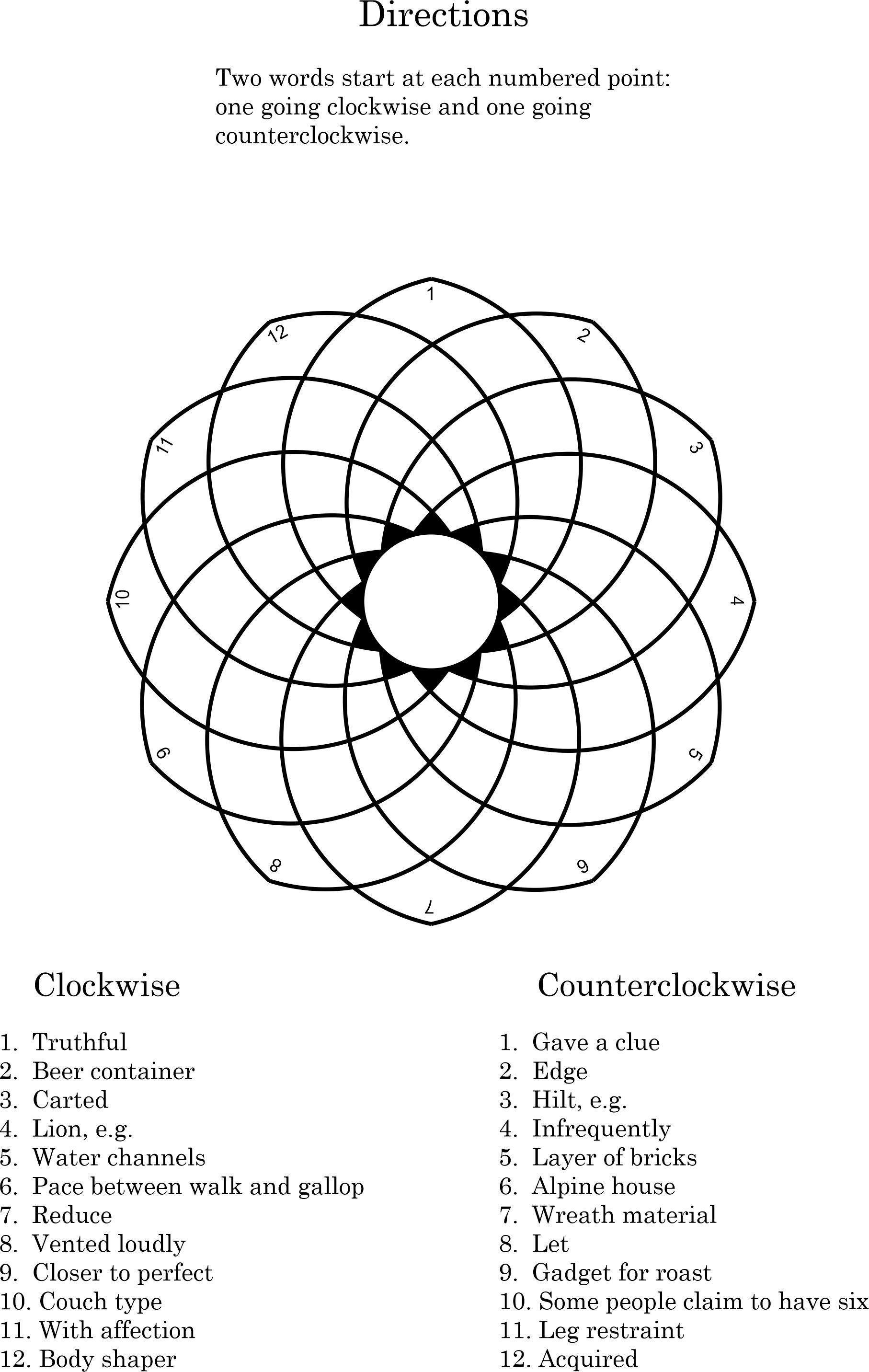 I did one of these for my last puzzle. I decided to make it a little harder and use 6-letter words. Hoo boy was that a mistake! This one was very difficult to construct. Hope you like it! Solve the puzzle and enter the letters of the numbered spaces, starting from the top and going clockwise, into Certitude.