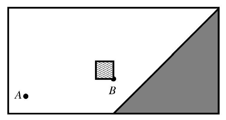 In der südöstlichen Ecke des Raumes befindet sich ein riesiges dreieckiges Becken mit flüssiger Schokoladeglasur; Südseite und Ostseite des Beckens sind jeweils 18m lang. Der Punkt A ist 3m von der Südseite und 3m von der Westseite der Backstube entfernt. Der Punkt B ist 6m von der Südseite und 18m von der Westseite der Backstube entfernt (und fällt daher mit der Südostecke des Liftschachts zusammen).