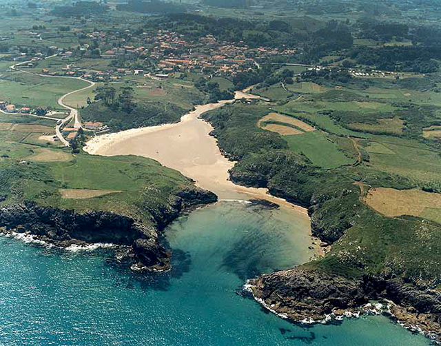 En su playa desemboca el arroyo "Guerra" o "Vallina" que es remontable en pleamar no muchos metros, por lanchas sin apenas calado. En bajamar queda en seco. Su arena blanca contrasta con el verde esmeralda o azul turquesa de sus aguas y el verde intenso de la tierra asturiana.