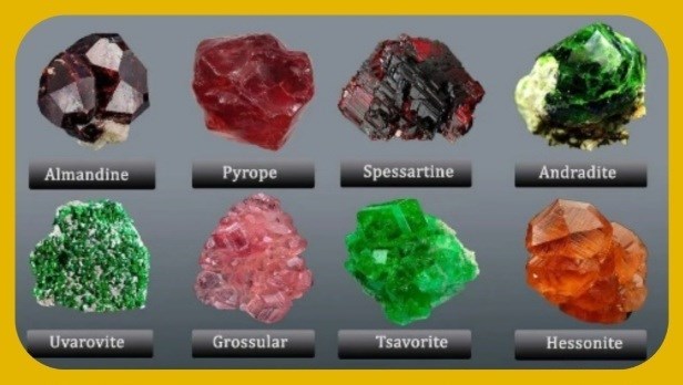 - Grossulár: Červený, oranžový, žlutý nebo zelený granát obsahující vápník a hliník.