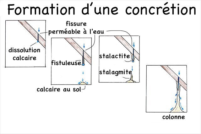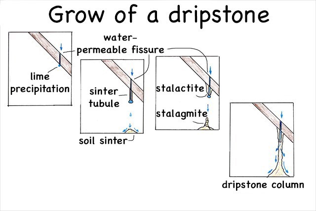 Les précipitations absorbent le dioxyde de carbone de l'atmosphère, s'infiltre dans le sol et y absorbe les acides organiques. Cela permet de dissoudre le carbonate de calcium (chaux) dans l'eau du castine. Cette calcaire dissoute se combine avec le dioxyde de carbone pour former de l'hydrogénocarbonate de calcium, qui est facilement soluble dans l'eau. Lorsqu'elle atteint le plafond d'une grotte, cette solution coule à travers les crevasses existantes. En la combinaison avec l'air, le dioxyde de carbone s'échappe et l'hydrogénocarbonate de calcium est reconverti en carbonate de calcium peu soluble dans l'eau (chaux). L'eau s'évapore, ce qui reste est de la chaux, qui forme des stalactites au cours de milliers d'années.