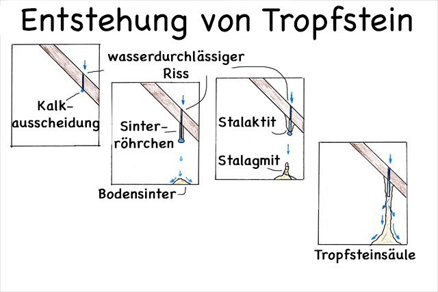 Der Niederschlag nimmt aus der Atmosphäre Kohlenstoffdioxid auf, versickert im Boden und nimmt dort organische Säuren auf. Dadurch kann aus dem Kalkstein Calciumcarbonat (Kalk) im Wasser gelöst werden. Dieser gelöste Kalk verbindet sich mit dem Kohlenstoffdioxid zu Calciumhydrogencarbonat, welches gut wasserlöslich ist. Beim Erreichen einer Höhlendecke tropft diese Lösung durch vorhandene Felsspalten. Beim nun erfolgenden Zutritt von Luft entweicht das Kohlenstoffdioxid, das Calciumhydrogencarbonat wandelt sich wieder in das schwer wasserlösliche Calciumcarbonat (Kalk) um. Das Wasser verdunstet, übrig bleibt Kalk, welcher im Laufe von Jahrtausenden die Tropfsteine bildet.