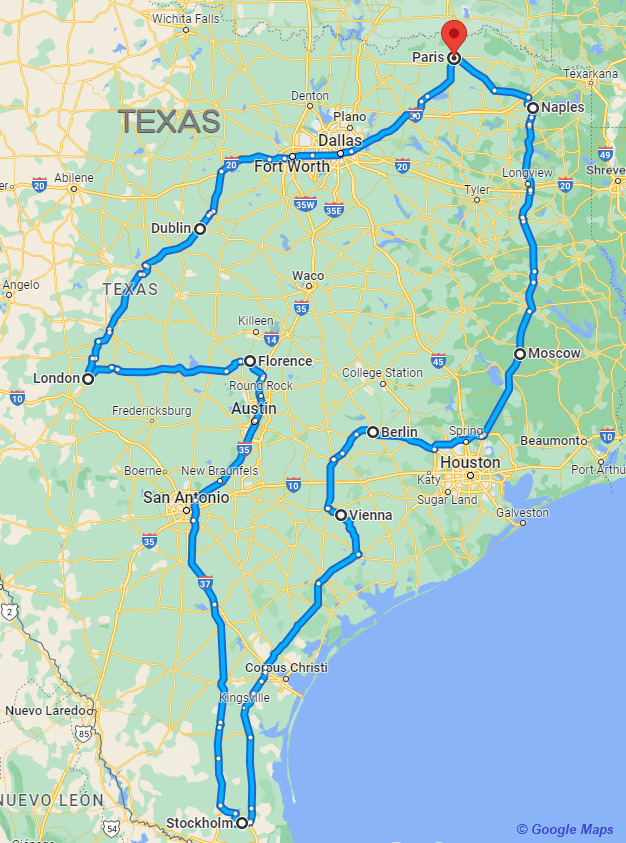 Näin joskus internetissä jutun, jonka mukaan yhden USA:n osavaltion sisällä on mahdollista tehdä 'Euroopan kiertoajelu'. Ja toden totta, kyllähän se onnistuu. Alla olevassa kartassa on yksi oma versioni, jossa reitti kulkee Pariisista Napolin, Moskovan, Berliinin, Wienin, Tukholman, Firenzen, Lontoon ja Dublinin kautta takaisin Pariisiin. Lukuisia muitankin reittivaihtoehtoja on, sillä sopivan nimisiä kaupunkeja kyseisessä osavaltiossa kyllä riittää.
