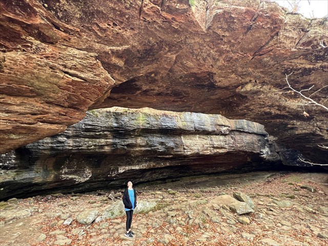 According to Forest Services, early settlers reportedly used this arch to move their wagons and livestock across the streambed during wet weather. Native Americans even used the overhang as shelter on hunting trips, as well as some of the other caves and formations along the bluff line across the cove.