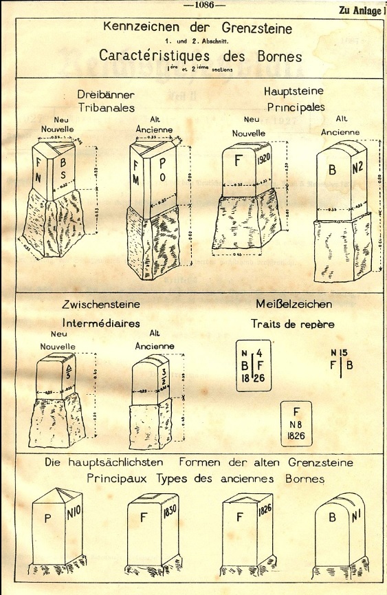 A certains endroits, il y a trois générations de bornes, (médiévale, traité de 1829, contemporaine).