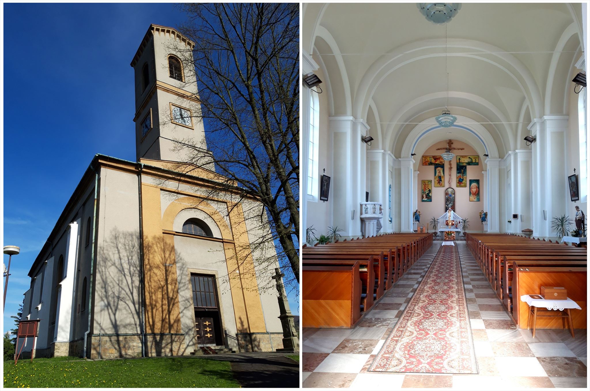 Od kamene po cestě vzhůru projdete kolem kříže a zároveň památníku obětem 1. světové války a na levé straně si můžete všimnout na kamenném pilíři sochy vlčí hlavy s dítětem v tlamě. O tragické události, na kterou tato vlčí hlava odkazuje, se můžete dočíst na nedaleké informační tabuli, věnované pozdně empírovému kostelu Nanebevzetí Panny Marie. Přímo před vstupem do kostela stojí další kamenný kříž a když se podíváte na kamenné schody před hlavními dveřmi, spatříte vytesaný letopočet, ze kterého vás budou opět zajímat jednotky a desítky let, ve tvaru 18HI.