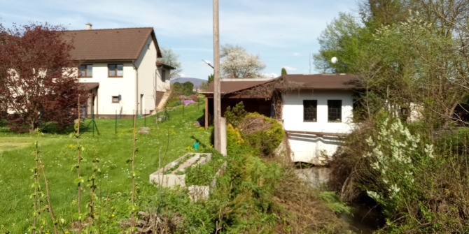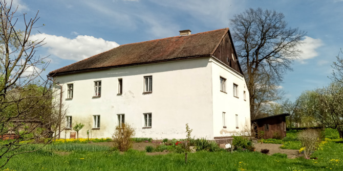 Od stage směrem na JV (přes náhon) vidíte dvě bílá stavení se sedlovou střechou umístěná vůči sobě do tvaru písmene L. Vás bude zajímat ta budova blíže k náhonu), což je bývalá sýpka. Druhá budova je dnes obytná.