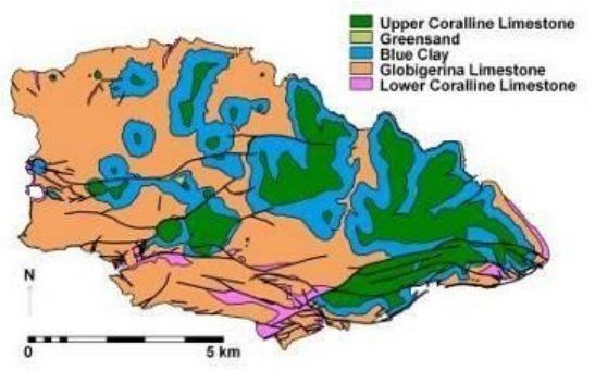 - The Globigerina Limestone Formation appears as a yellowish,