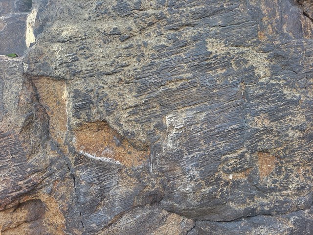 Part of the rock is covered with a black, lacquer-like pattina. This is the appearance of the desert varnish in the form caused by wind sanding.