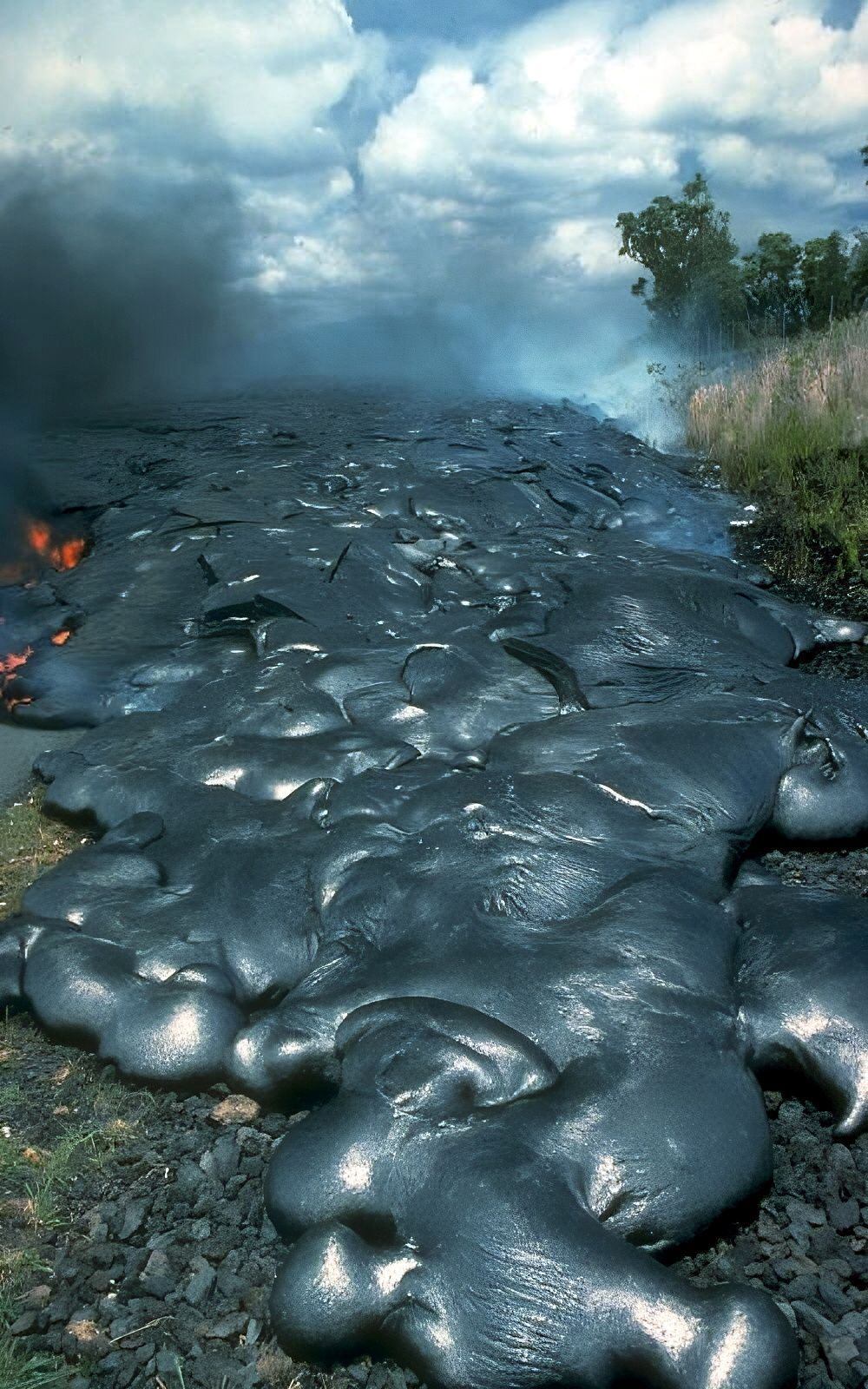 Wenn die sehr heiße Lava unter einer horizontal erstarrenden Kruste dahin strömt, zerbricht die Kruste häufig in einzelne Schollen. Diese können sich aufwerfen, oder auch auseinanderrutschen und Lavakissen hinterlassen. Bei einem noch aktiven Lavastrom kann die erstarrte Lavadecke bis zu 50 cm dick werden, daher können sich unter der Kruste sogenannte Lavaröhren bilden.