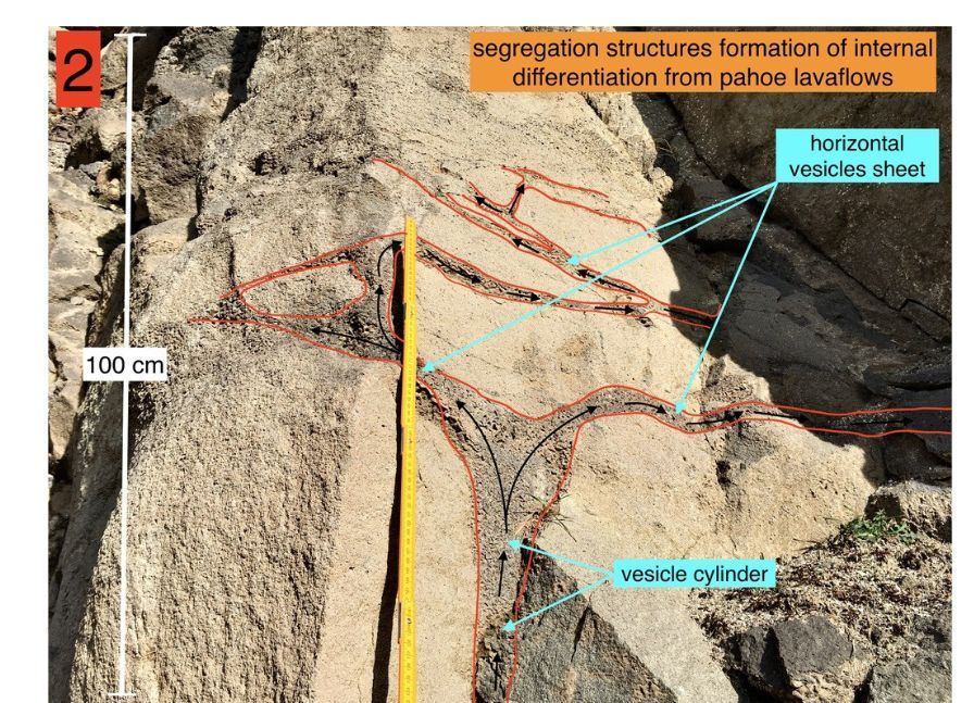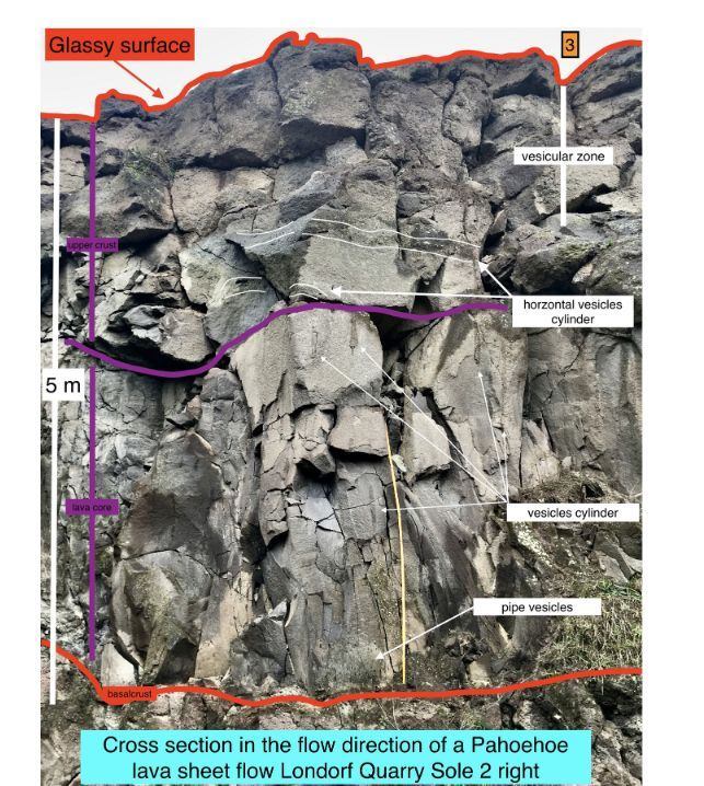 Die Höhe in diesem Anschnitt beträgt ca. 5 Meter. Die inneren Strukturen des Blattstromes sind hier gut zu erkennenen: Pipe vesicles = Pfeifenvesikel; Vesicle cylinder - Vesikelzylinder; Horizontal vesicle sheet = horizontales Vesikelblatt. „Bottom chilled zone“entspricht der unteren Kruste (lower crust). Die rote 2 in den Figuren markiert eine eigene Serie, wie auch folgend. Pfeifenvesikel (pipe vesicles)
